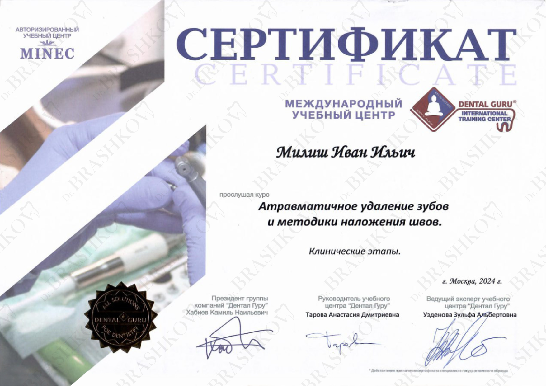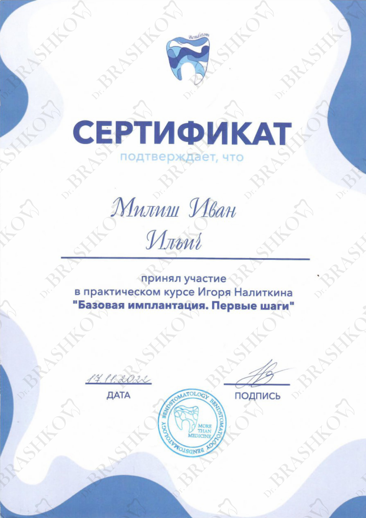 В 2023 году успешно завершил ординатуру по специальности «Стоматология хирургическая» в том же ведущем вузе — МГМСУ им. А. И. Евдокимова.