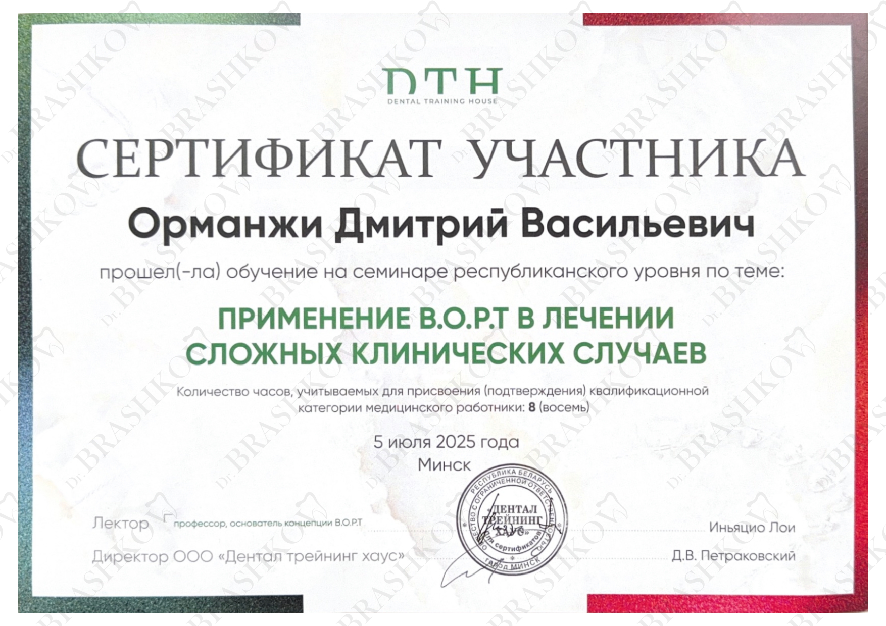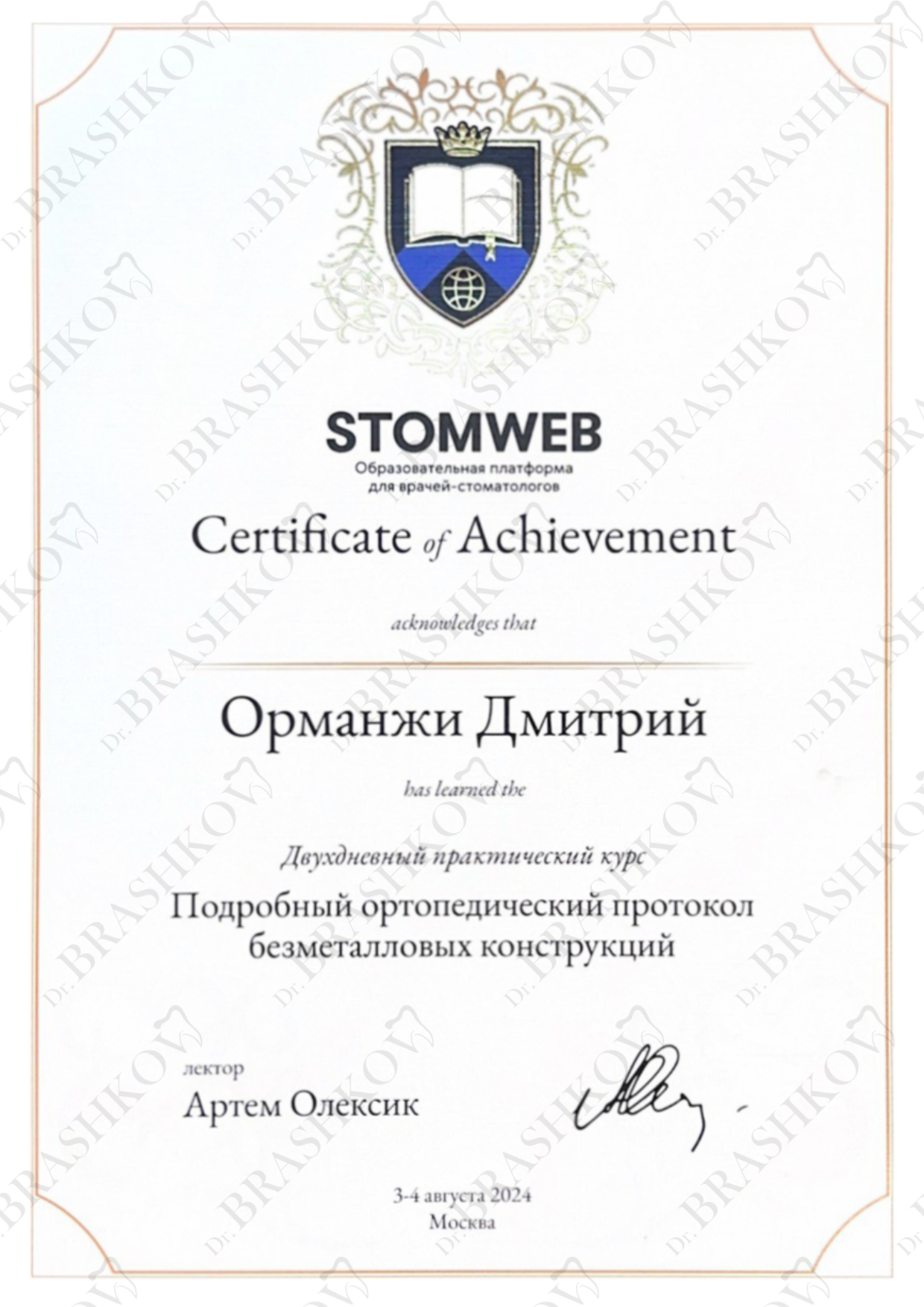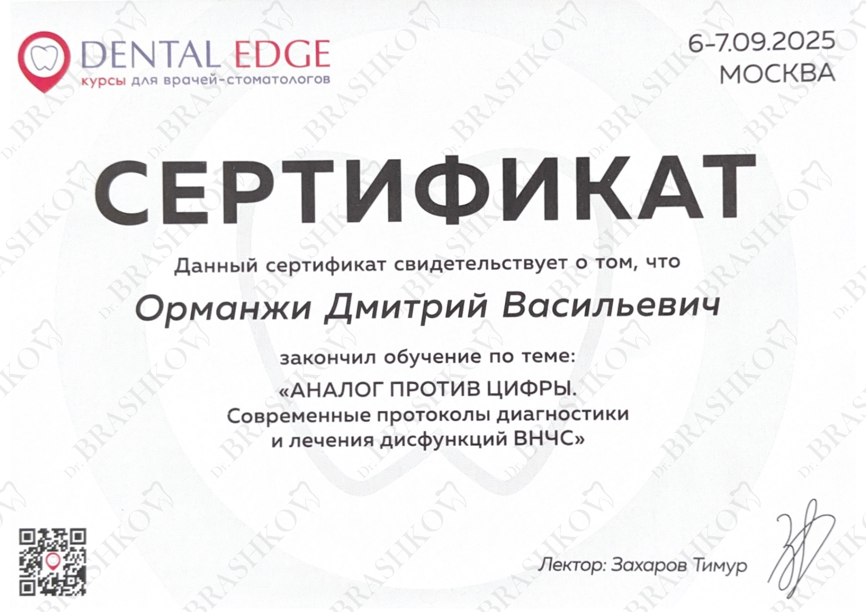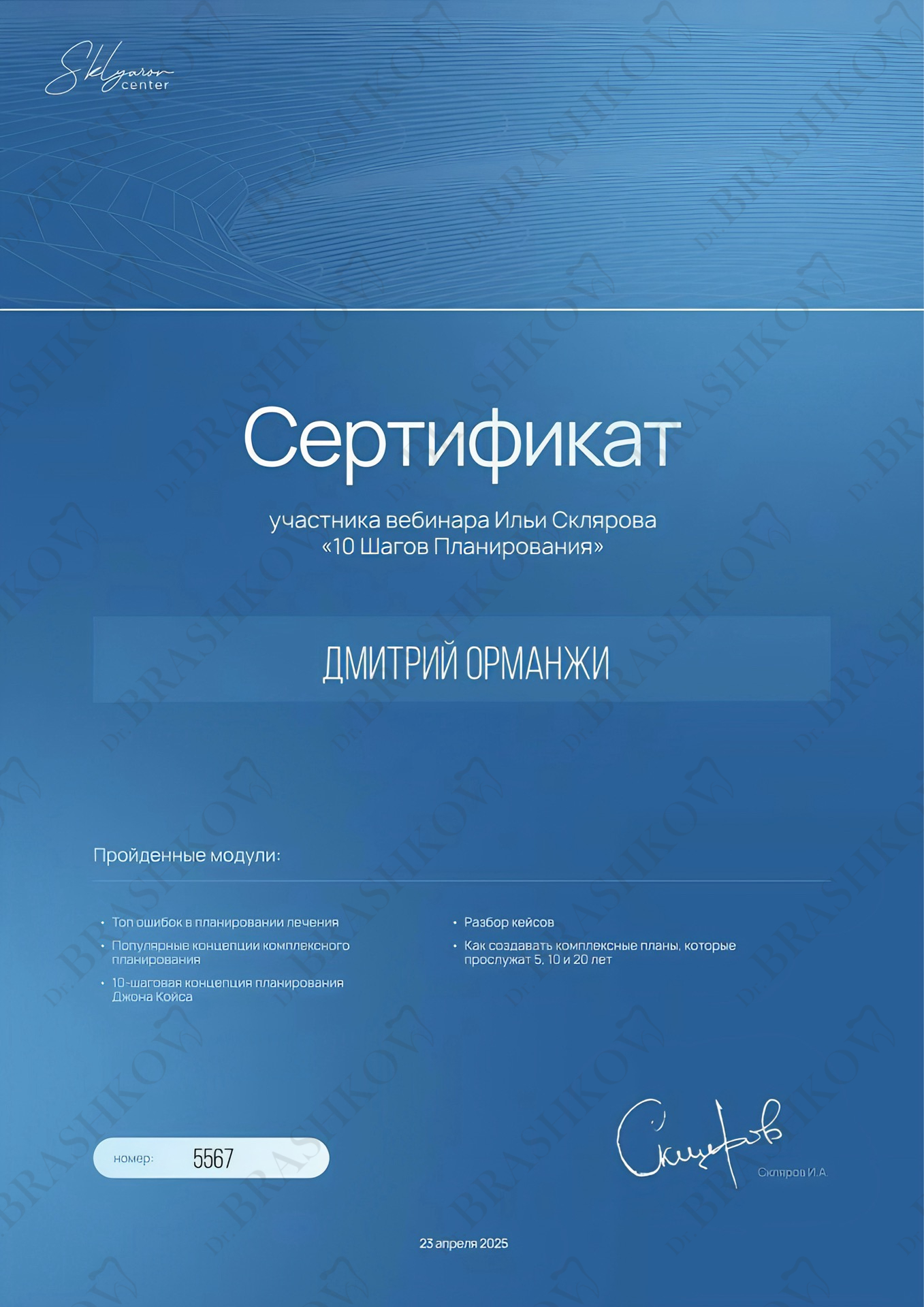 • В 2024 году завершил обучение по программе «Стоматология общей практики» в Национальном НИИ общественного здоровья имени Н. А. Семашко.