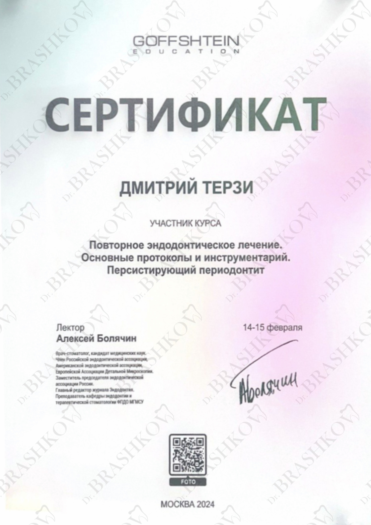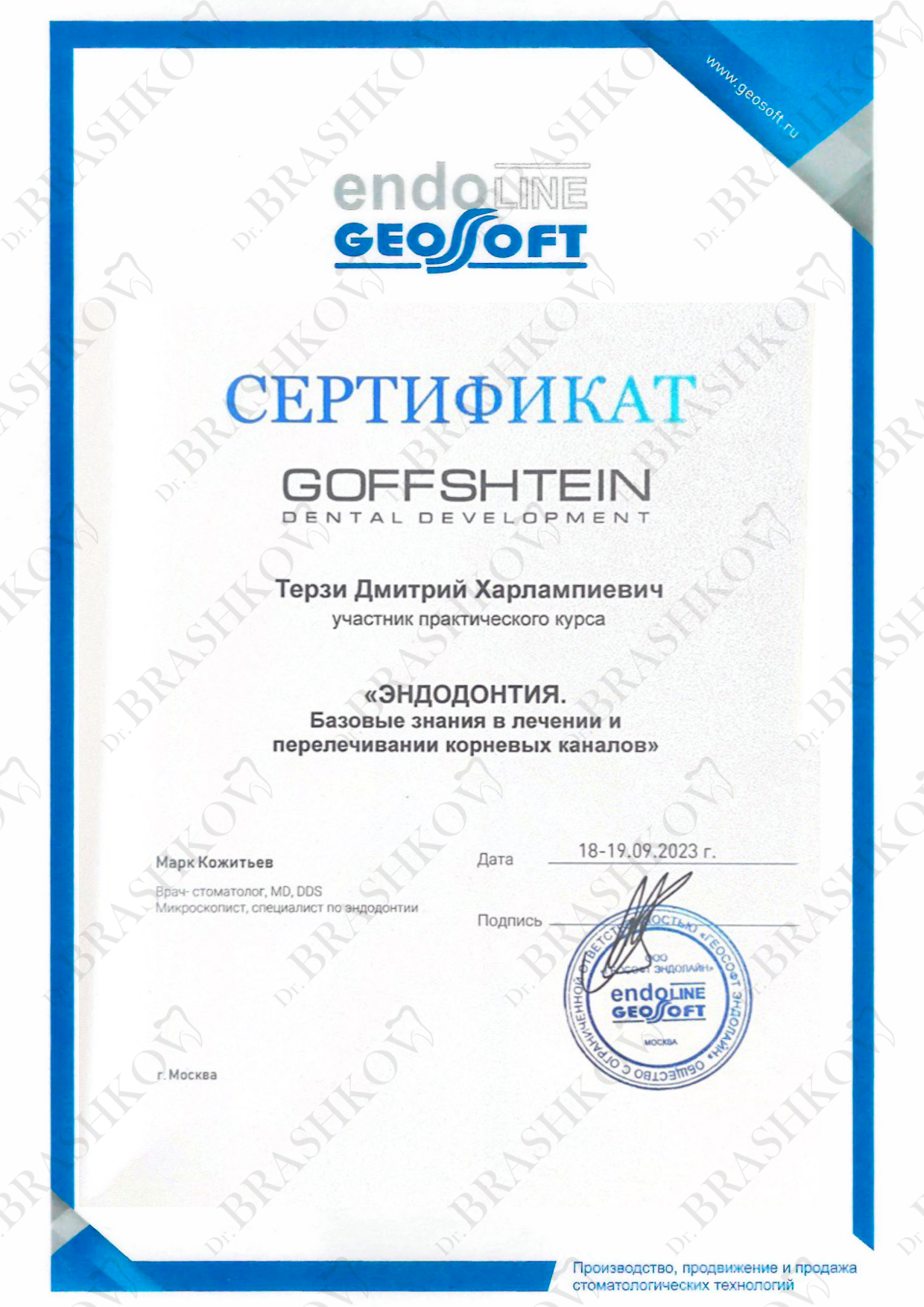 • Регулярно совершенствует квалификацию в ведущих учебных центрах, специализирующихся на эндодонтии и эстетической реставрации.