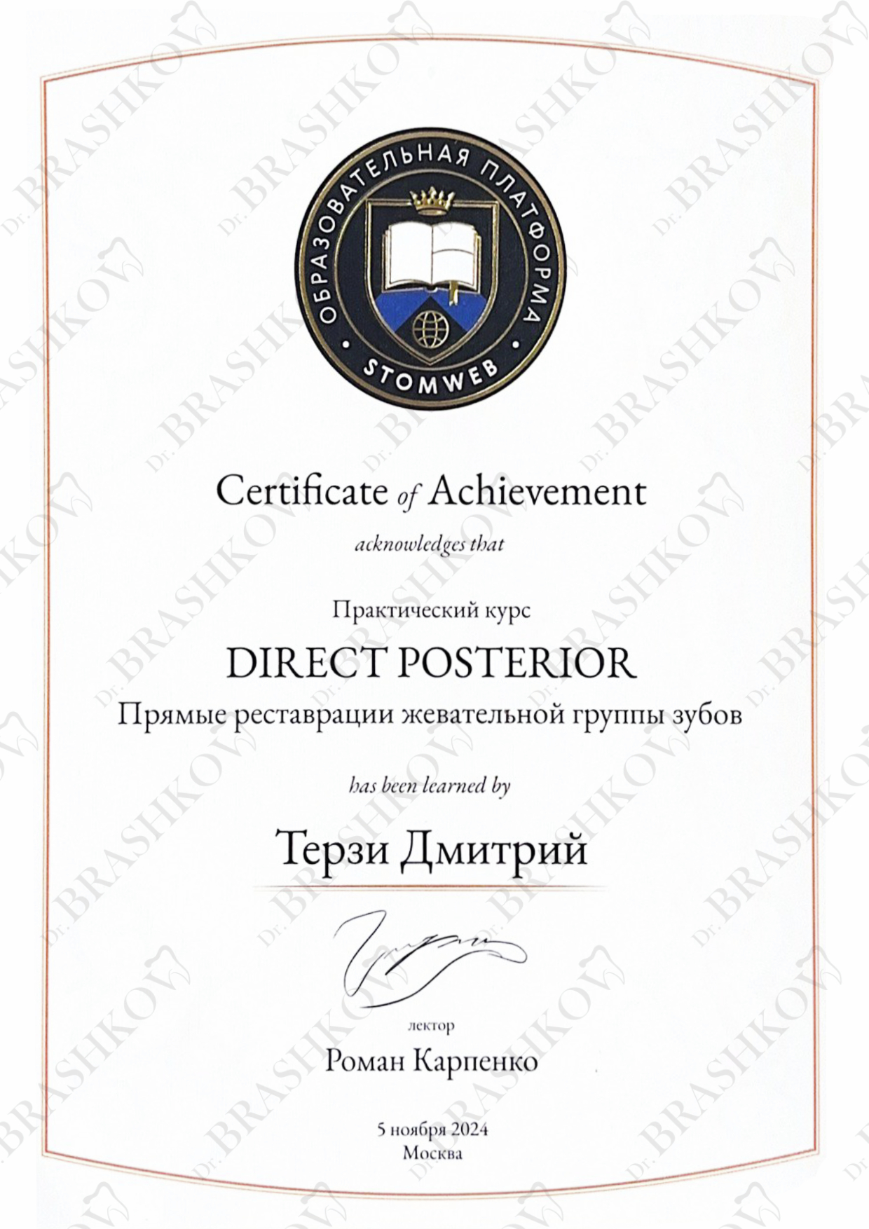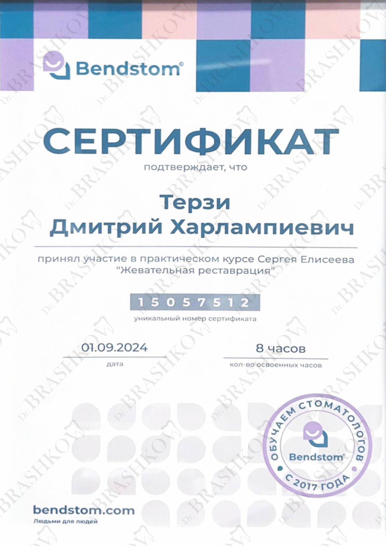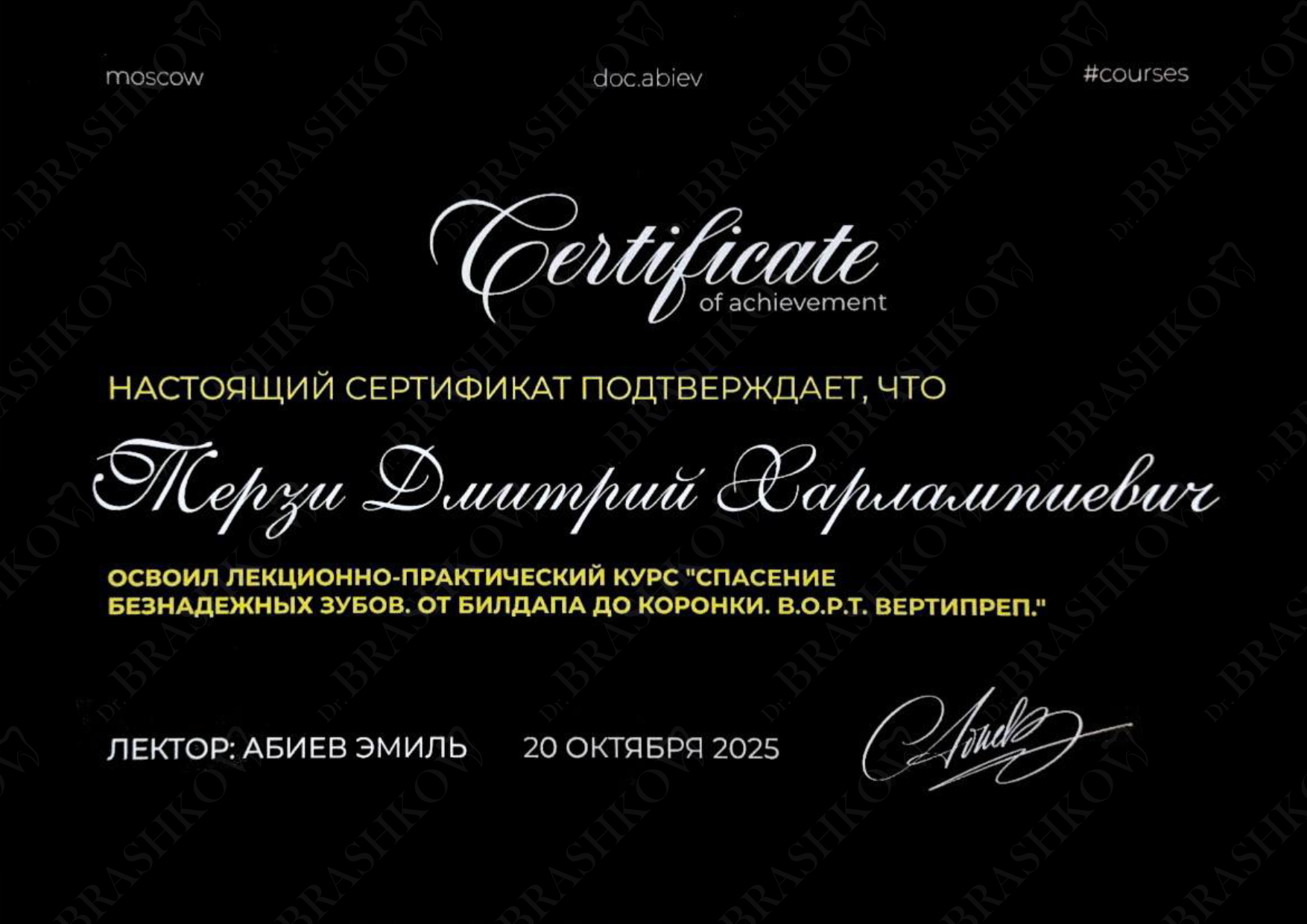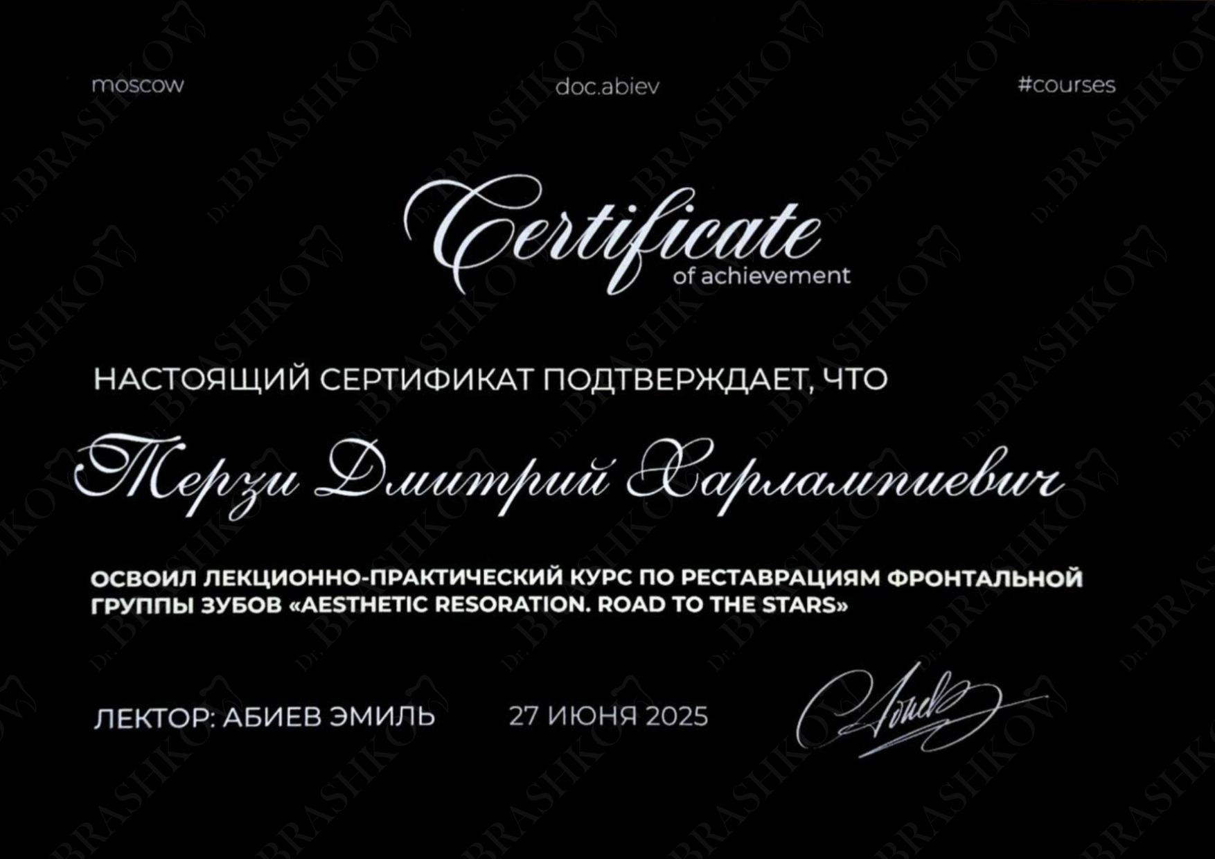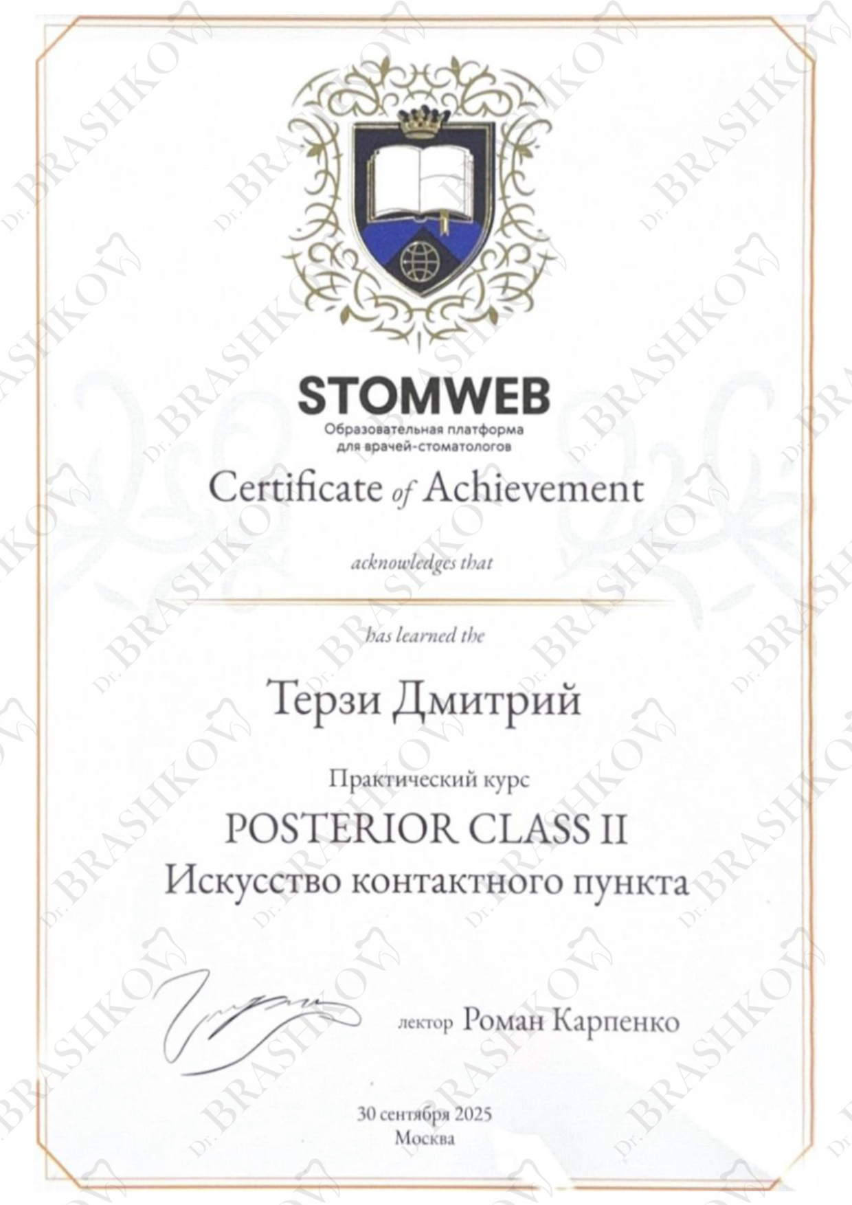 • В 2024 году завершил обучение по программе "Стоматология общей практики" в Национальном НИИ общественного здоровья имени Н. А. Семашко.